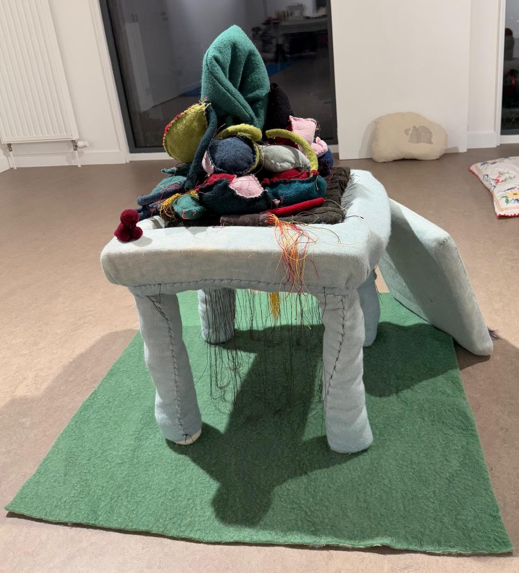 L’idée du format muséal est d’investir les espaces du lieu de vie en s’appuyant sur le mobilier déjà en place, en habillant ces espaces et ce mobilier de l’installation formant de petits ilots. Christelle Hunot plonge ainsi dans l’univers des tous petits qui (re)découvrent leur environnement sous un autre aspect, d’un autre regard.